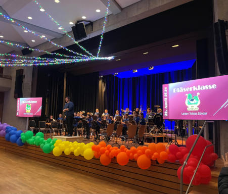 Konzert der Bläserklasse  Am Samstagabend war es endlich soweit: Im bunt geschmückten Kulturzentrum fand der erste öffentliche Auftritt unserer Bläserklasse statt und es war ein voller Erfolg! Nach drei Liedern, die unsere MusikerInnen fehlerfrei vorspielten, jubelten die zahlreichen BesucherInnen so lange, bis mit "Hard Rock Blues" eine gelungene Zugabe folgte. Wir sind sehr stolz auf unsere SchülerInnen und freuen uns, wenn sie bald wieder mit ihrem Dirigenten Tobias Sünder auftreten werden.